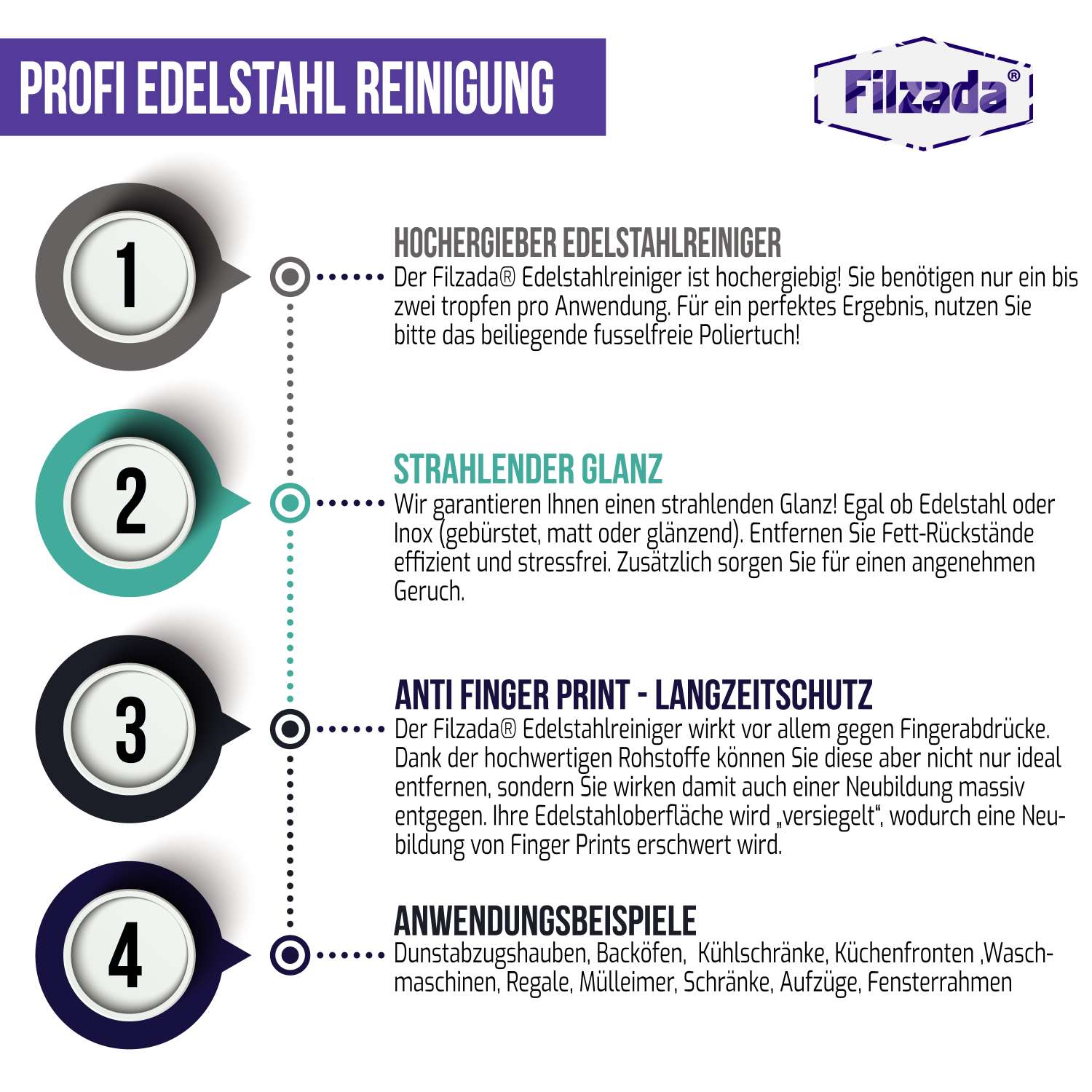 So wenden Sie den Filzada® Edelstahlreiniger richtig an: