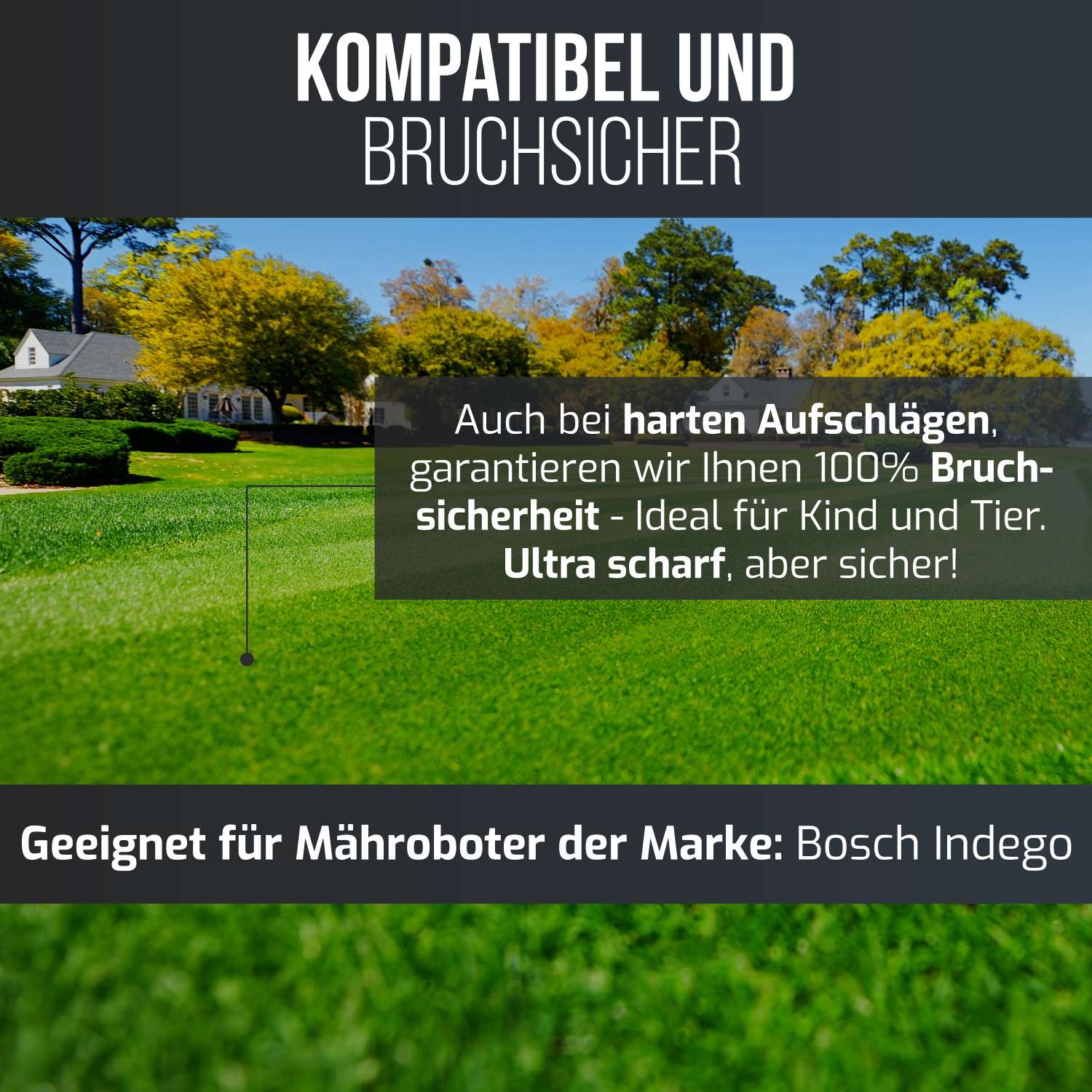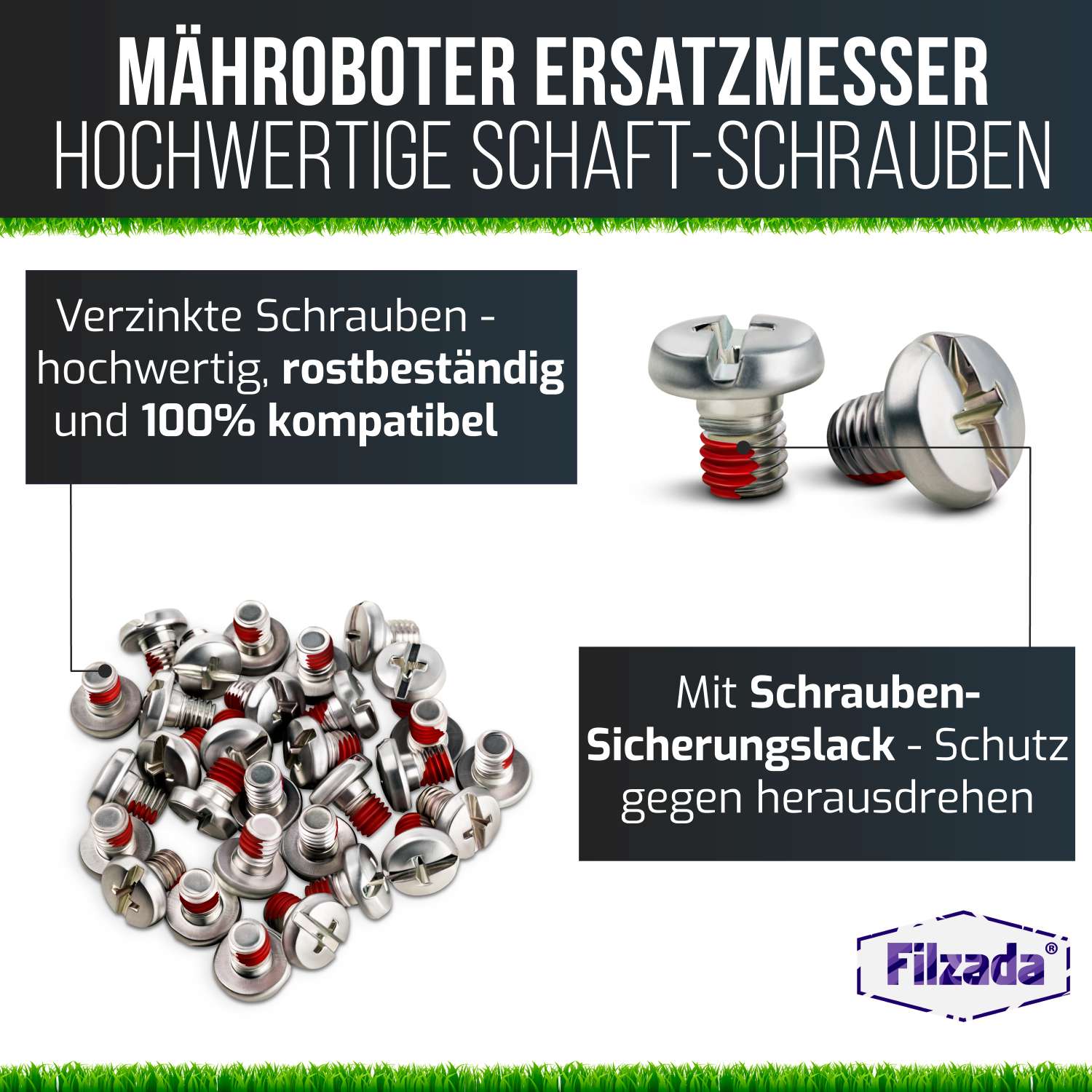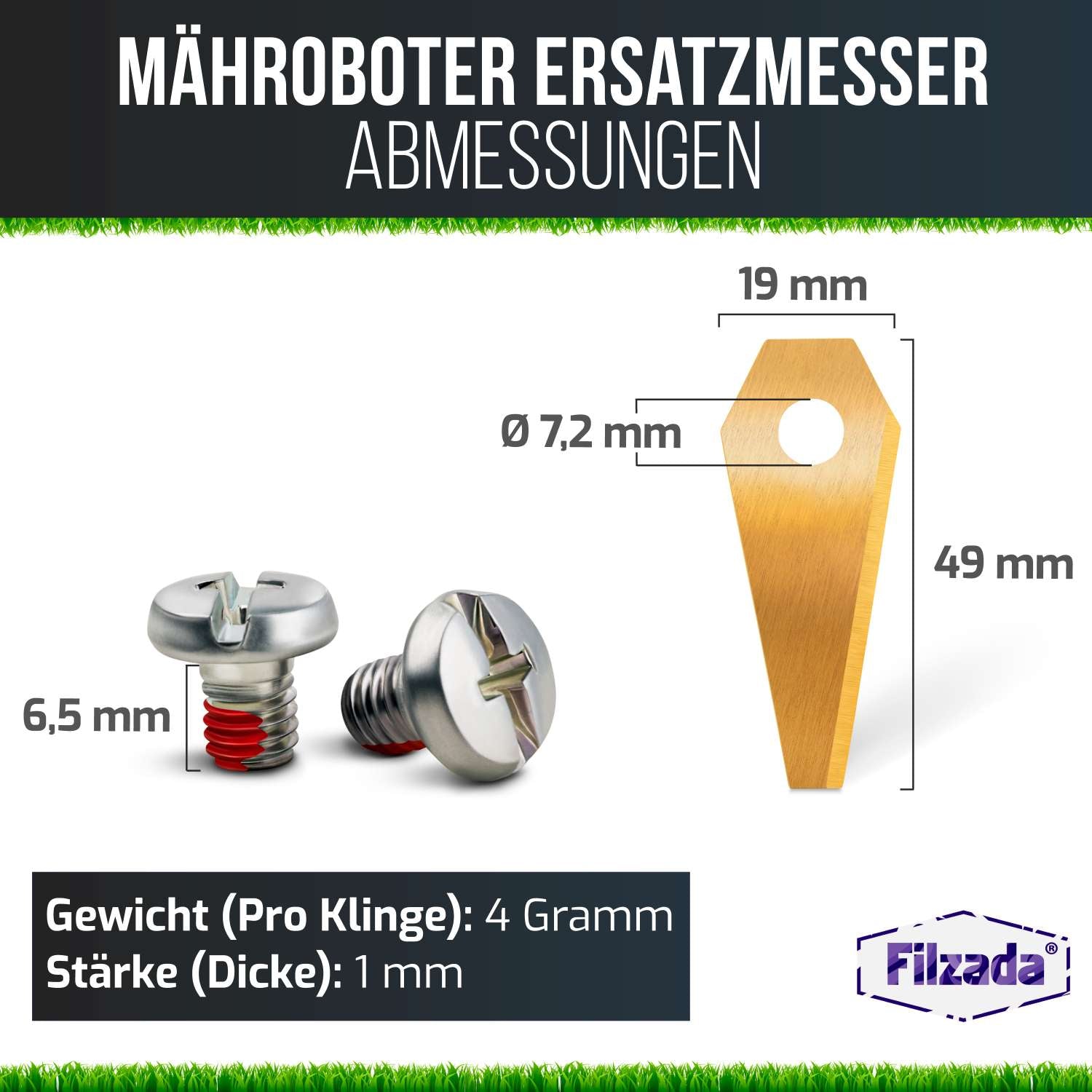 Schärfer geht kaum. Die Ersatzmesser sind aus hochwertigem Edelstahl gefertigt und besitzen eine hochwertige Beschichtung, für eine garantiert lange Nutzungsdauer und noch bessere Schnittbild. Die beiliegenden Schrauben sind verzinkt und somit rostbeständig. Zusätzlich besitzen die Schrauben einen Schrauben-Sicherungslack, zum Schutz gegen automatisches herausdrehen. Der hochwertige Stahl gewährleistet, dass die Klingen nicht brechen können, auch wenn sie auf Widerstand wie Steine o.Ä. treffen. Optimal für die Sicherheit von Kind und Tier.