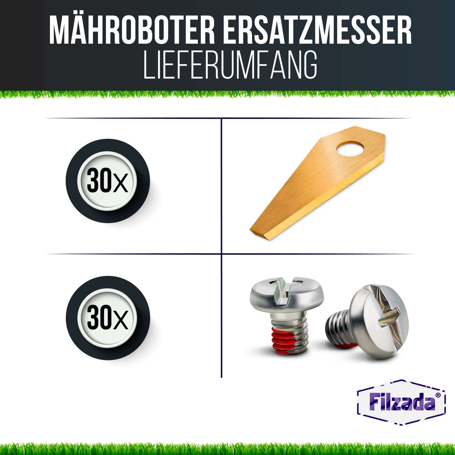 Mit diesen Mähroboter Messern sind Sie bestens ausgestattet - bestellen Sie jetzt Ihre Ersatzklingen geeignet für Bosch von Filzada®.
