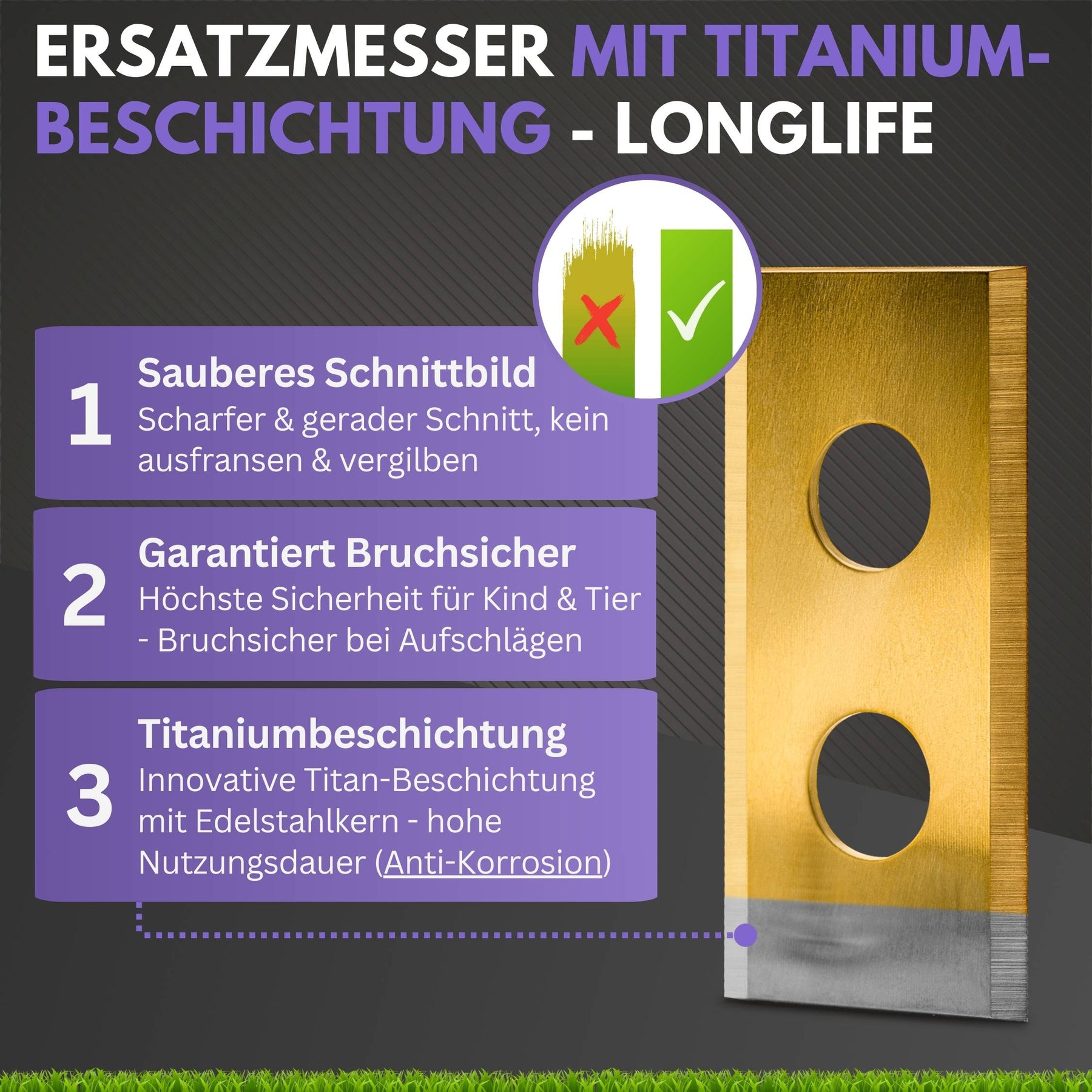 Die Messer sind aus rostfreiem Edelstahl gefertigt und besitzen eine spezielle Beschichtung, wodurch eine lange Nutzungsdauer gewährleistet wird. Die beiliegenden Schrauben sind verzinkt und somit rostbeständig. Die hochwertigen Materialien gewährleisten, dass die Klingen nicht brechen können, auch wenn sie auf Widerstand wie Steine o.Ä. treffen. Optimal für die Sicherheit von Kind und Tier.