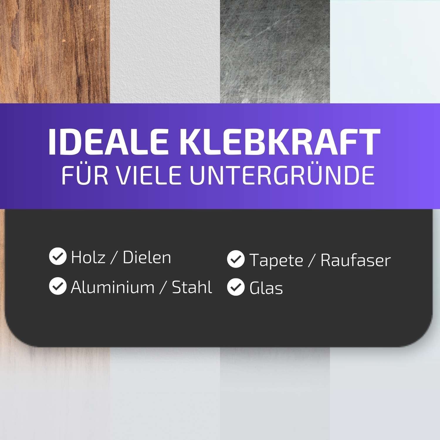 Der besonders hochwertige Kleber garantiert einen extremen Halt und eine lange Haltbarkeit bei gleichzeitiger rückstandloser Entfernung. Klebt garantiert auch auf Raufaser-Tapete.